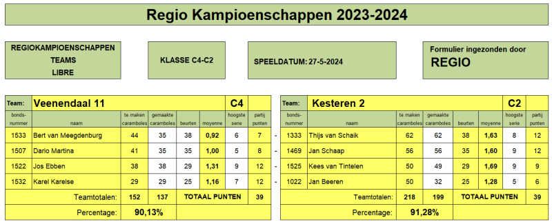 Veenendaal 11 en Kesteren 2 spelen gelijk met 39-39, Kesteren wint op percenateg met 91,28%-90,13%.